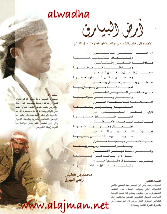 السلام عليكم ورحمة الله وبركاته شحالكم جميع..اربكم طيبين.. الوكاد.. هذا اللقاء حصري دورته بالنت ماعينته الصراحه كنت متعيجزه لا انسخه بالسكنر,, يوم عاد ماعينته قمت وعانّي الله ونسخته,, اترككم مع هاللقاء القمه للشاعر اللي لو ويش اقول في حقه ماوفيته"محمد بن حمد بن فطيس المري",, أتمنى انه حاز على اعجابكم,,