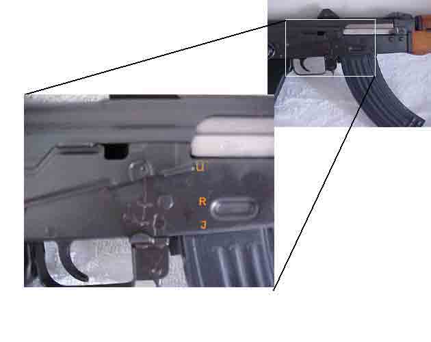 الصورة التالية تبين وضع خروج الطلقات إما آلي ( رشاش ) أو مفرد ( طلقة بعد طلقة ) :