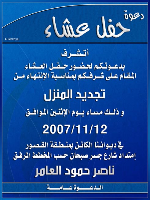 يسرني دعوتكم لحضور حفل الإستقبال و العشاء المقام على شرفكم