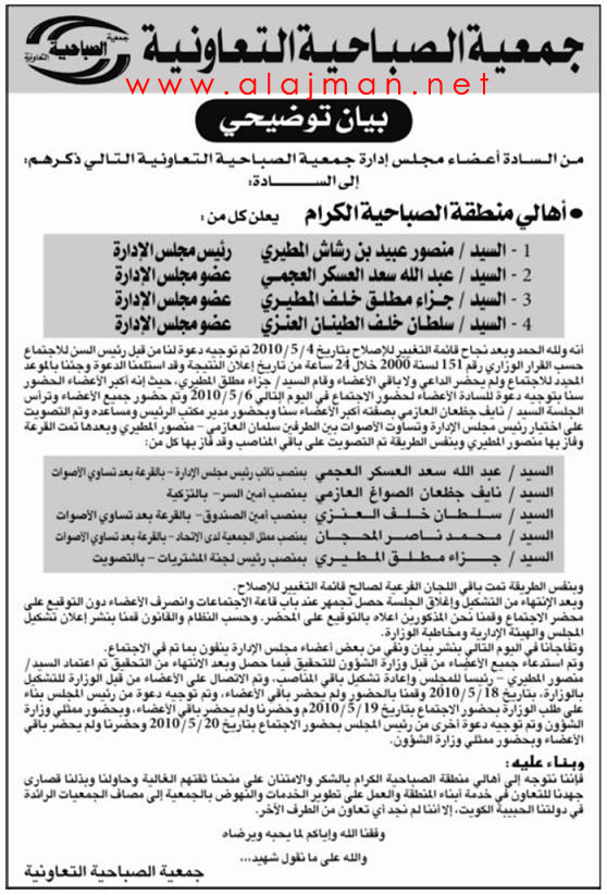 بيان توضيحي من أعضاء مجلس إدارة جمعية الصباحية التعاونية